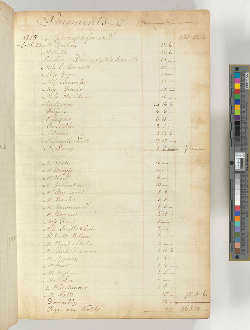 Moreover, some theatrical business was conducted privately by the theatre’s proprietor out of (or into) their own pocket; Thomas Harris (owner and/or manager, 1767-1820) seems to have had a very busy private account used for Covent Garden business, and, although he recouped the relevant expenditure from the theatre’s treasury, and paid the relevant receipts on to it, the account books’ records of such transactions are highly obscure, and it is doubtful that there was a perfect reconciliation between Harris’s account and the theatre’s. The theatres, especially Drury Lane, also set up supplementary funds concerned with particular areas of activity, or as sinking funds; or became overdrawn with their bank; or operated through trusts and trustees; all of which activity, happening at least one remove from the theatre’s main treasury, is represented only hazily, or not at all, in the account books.